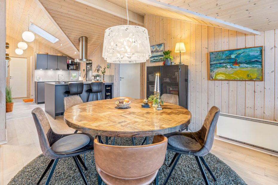 Den store og åbne stue i sommerhuset skaber en behagelig atmosfære, mens de sydvendte vinduer giver lys og varme. Sæt dig til rette i det hyggelige sofahjørne, imens resten af familien tilbereder aftensmaden i det moderne og veludstyrede køkken med gulvvarme, som ligger i åben forbindelse med stuen. Her er også en brændeovn, som spreder både varme og ekstra hyggelig feriestemning. Ved behov har I mulighed for at tænde for den energibesparende varmepumpe. Derudover er der også gulvvarme i gangen.