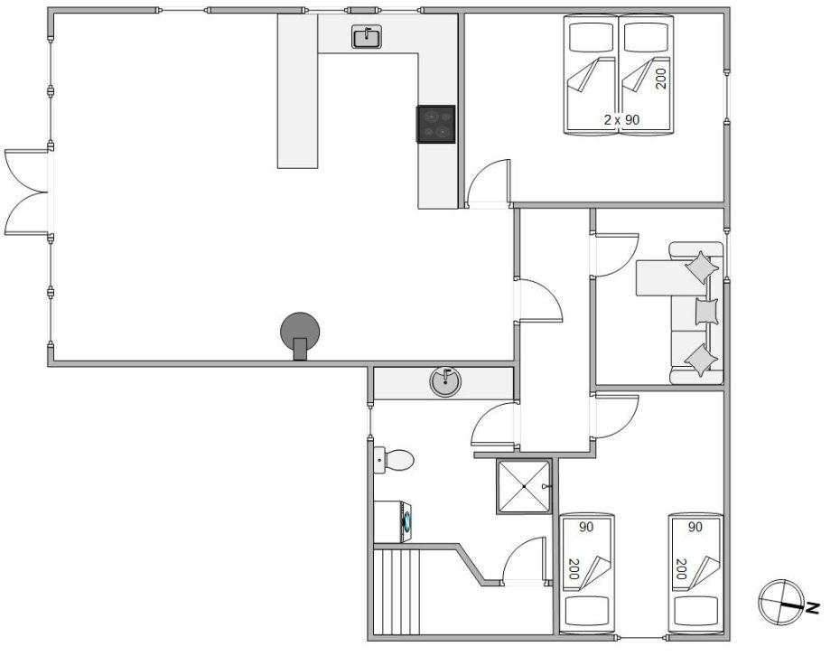 Det lyse og venlige køkkenalrum er i åben forbindelse med sommerhusets opholdsstue og brændeovnen er centralt placeret i rummet. I det flotte køkken finder I blandt andet 60 l. fryser, mikroovn og opvaskemaskine.