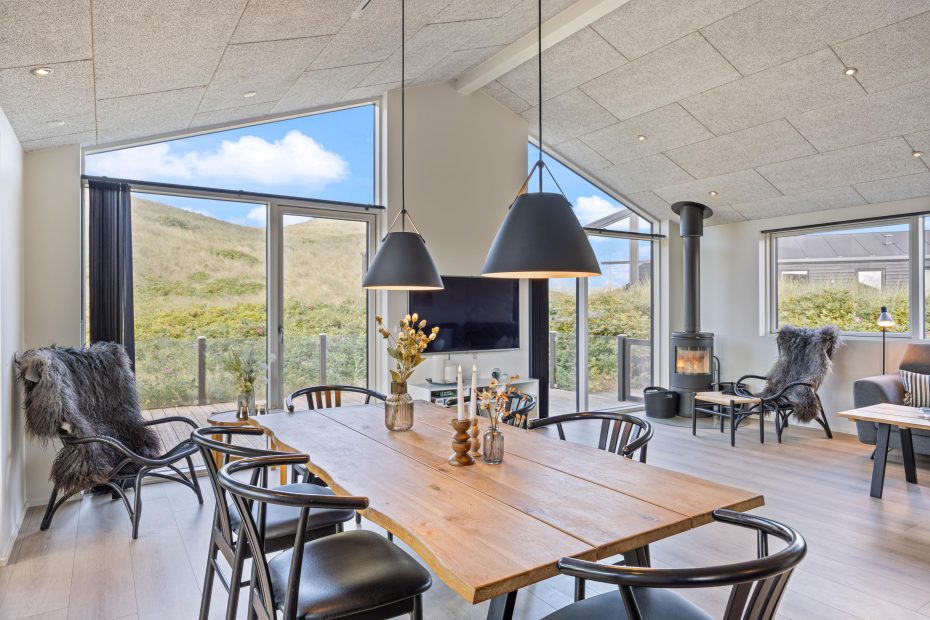 De store vinduer inviterer solens lys og den vestjyske natur indenfor, og gør de flotte omgivelser endnu mere indbydende. Især i det store opholdsrum, hvor stue og køkken er slået sammen, er der rigtig lyst og åbent. Her står også den klassiske brændeovn, som med sine knitrende flammer gør de mørke aftentimer og regnfulde efterårsdage endnu hyggeligere.