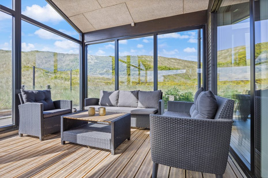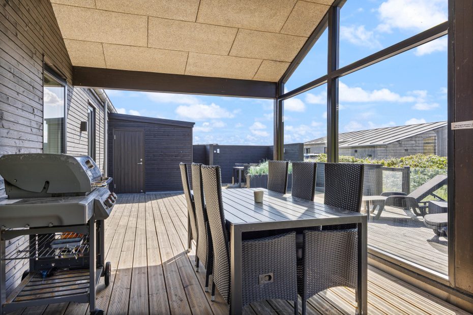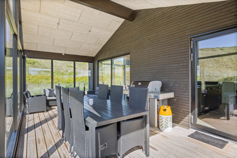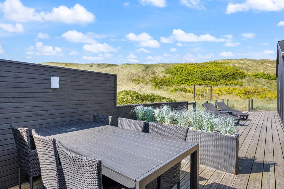 Den fede træterrasse går stort set hele vejen rundt om huset, og der er masser af afskærmning, så I til enhver tid kan sidde i læ for den friske vestenvind. Nyd feriedagene i de gode havemøbler og liggestole, og følg solen rundt dagen lang på den store terrasse.