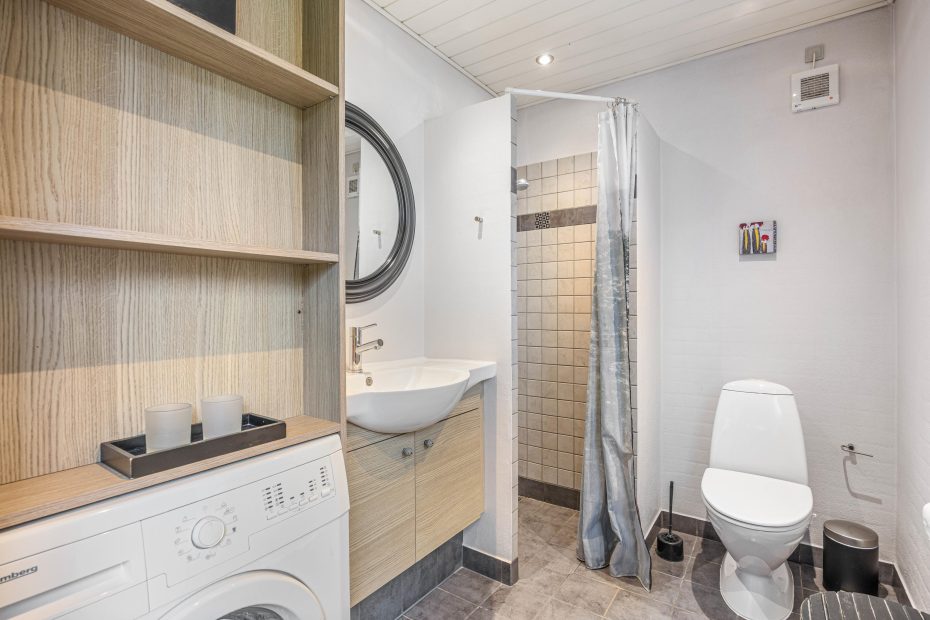 På badeværelset er der gulvvarme, hvilket gør morgenrutinerne ekstra behagelige, især på de køligere dage. Det er også her, I finder sommerhusets vaskemaskine, så I har mulighed for at vaske tøj og håndklæder under opholdet, hvilket kan være en stor fordel, især for længere ophold.