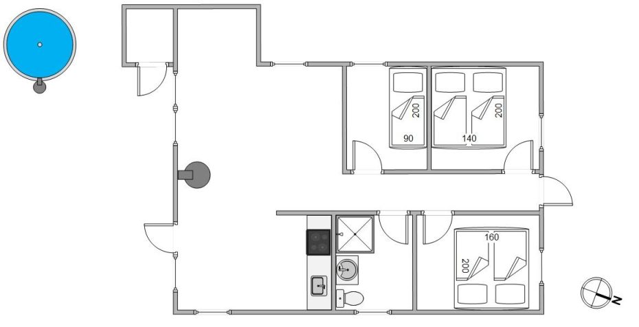 Husets 6 sovepladser er fordelt på 3 hyggelige soverum, 2 x dobbeltseng og 1 x enkeltseng, samt 1 soveplads i alkoven i stuen. Badeværelset er lyst og indeholder alt, hvad der er brug for.