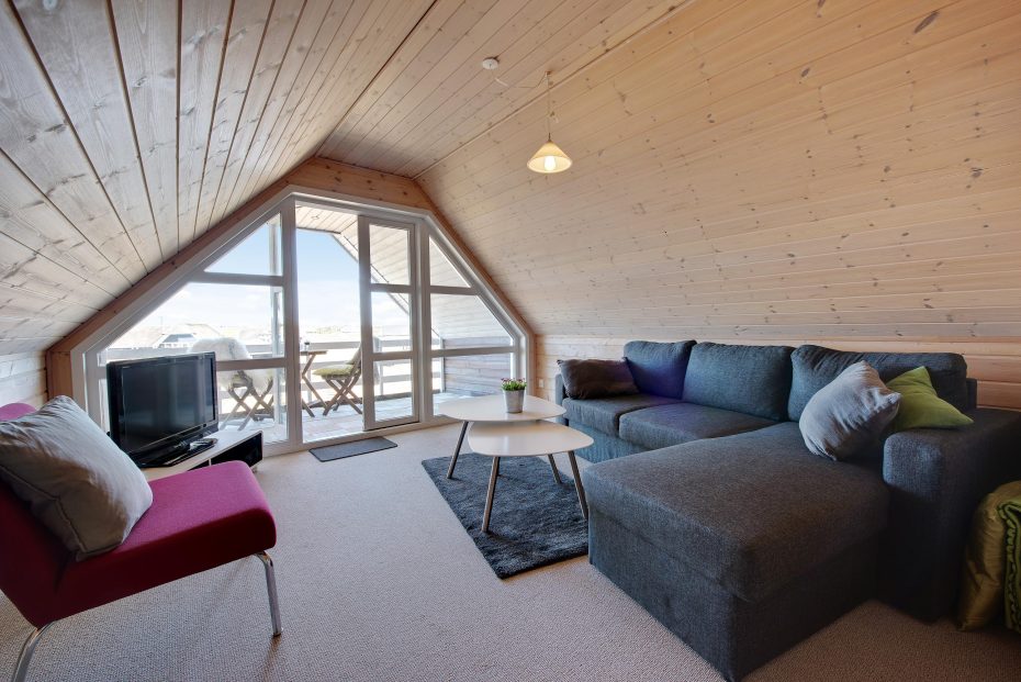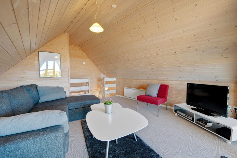 På 1. sal er der en lille stue med en sofa og et TV, og fra stuen og fra den lille altan er der en helt uovertruffen udsigt mod syd og mod sydvest. Slap af med en god kop kaffe – eller et glas vin – mens I nyder klitlandskabet og solnedgangen over klitterne. Det er tilladt at medbringe 2 hunde i dette sommerhus.
