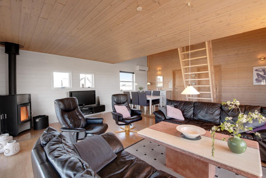 Udover et stort og lækkert badeværelse er der også et gæstetoilet med gulvvarme. På badeværelset er der gulvvarme, bruseniche, 2 personers hjørnespa og en sauna. Køkkenet er stort og godt indrettet med alle de moderne hjælpemidler, man kan ønske sig. Stuen er placeret i den vestlige del af feriehuset og er hyggeligt indrettet med gode møbler.