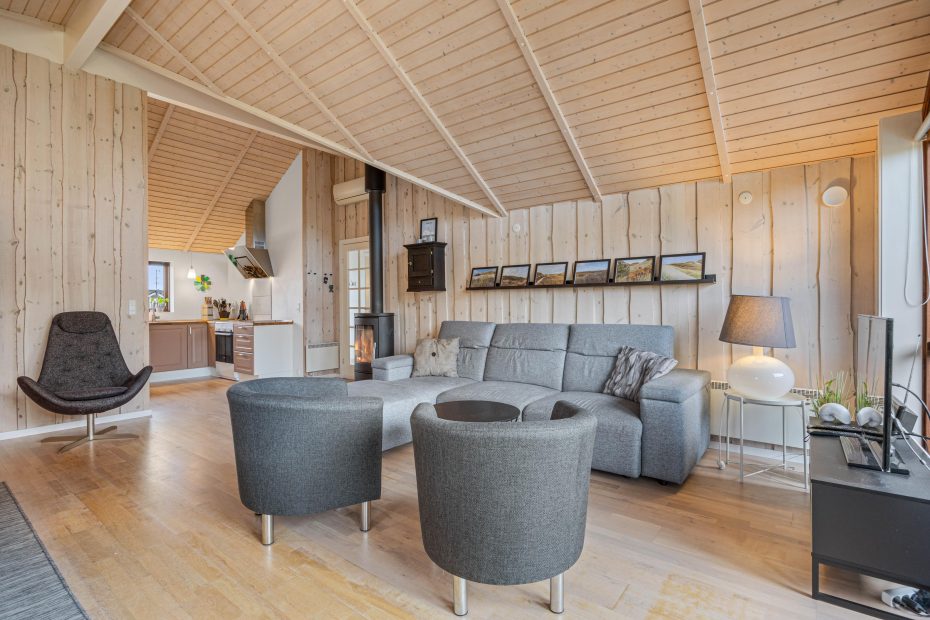 Feriehusets køkken er flot og lyst og indeholder både opvaskemaskine og mikroovn. Det ligger i åben forbindelse til stuen, så I stadig kan være sammen, når bedstemor lige klargør de nye kartofler, og far og bedstefar ligger og slapper af i de dejlige lænestole, inden grillen skal tændes op på husets læ-fyldte terrasse.