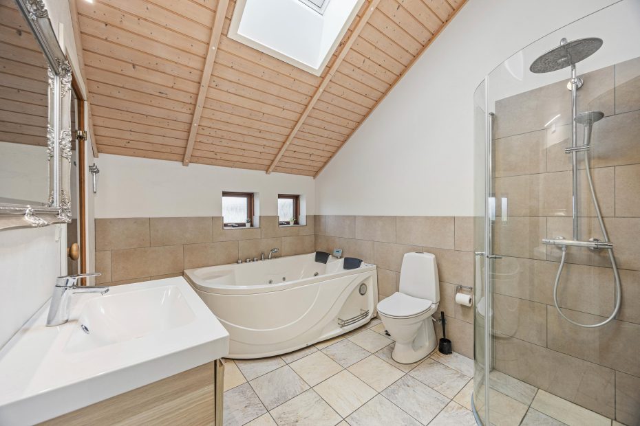 Feriehuset er bygget i 2012 og har 120m² I kan boltre jer på. Det er udstyret med en energibesparende luft til luft varmepumpe og har 2 badeværelser med gulvvarme. Det store badeværelse er udstyret med et spabad til 2 personer og en dejlig sauna.
