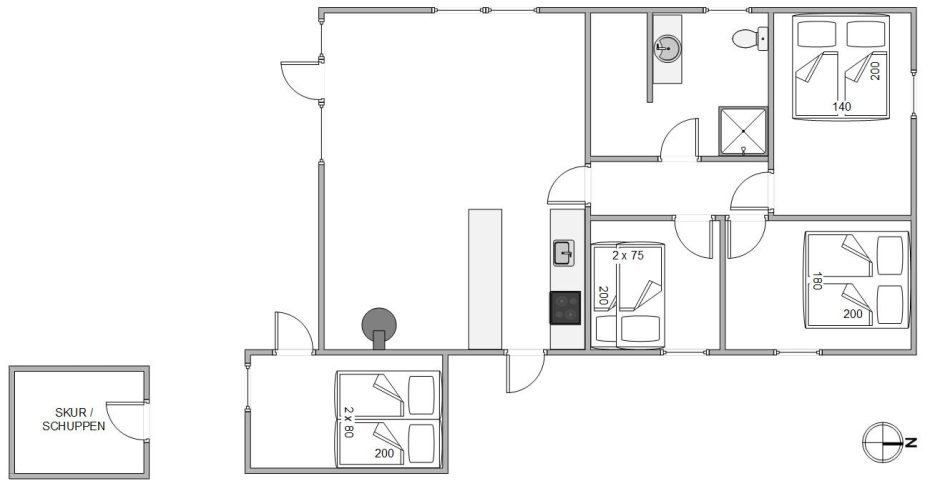 Feriehuset har plads til 6 personer, som kan nyde en afslappet ferie i det skønne sommerhus. Der er 3 soveværelser, hvoraf de 2 er indrettet med dobbeltsenge. På det sidste værelse finder I en køjeseng – perfekt til børnene. Desuden er der et hyggeligt anneks, hvor teenagerne eller bedsteforældrene kan få en god nats søvn. Her er der 2 enkeltsenge.