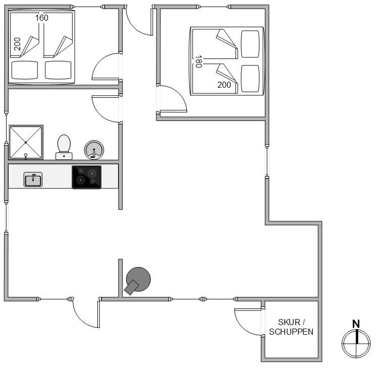 Et rigtigt sommerhus med praktisk indretning – her fornemmer man hygge og nærvær. Opholdsrummet er hjertet i huset. Stuen med sofa og alkove lægger op til afslapning med en god bog foran den knitrende ild i brændeovnen.