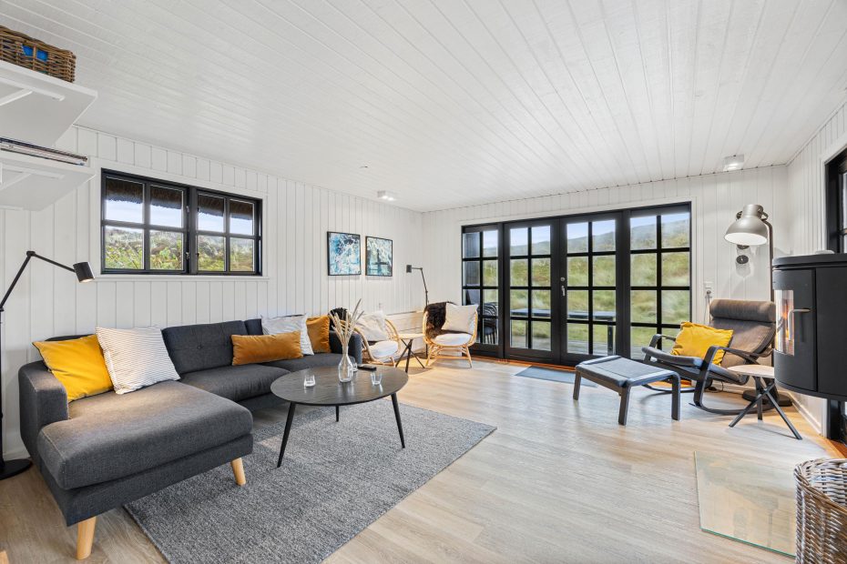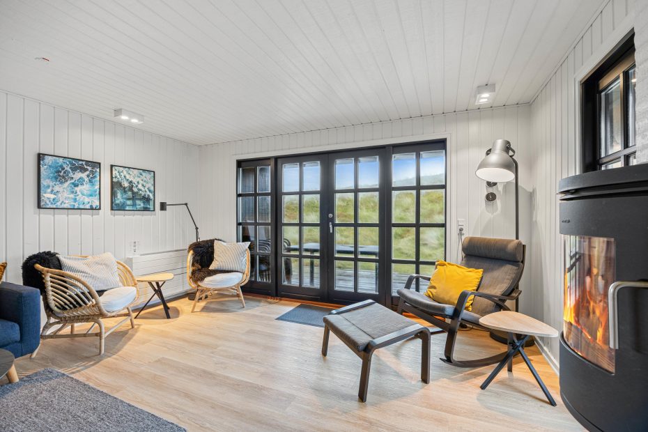 Hjertet og samlingspunktet er opholdsrummet med stue, spisestue og åben forbindelse til det praktiske og veludstyrede køkken. Stuen med de mange vinduer, som tager både lyset og naturen med sig indenfor, indbyder til total afslapning med en god bog eller med familiespil, mens ilden knitrer i brændeovnen.