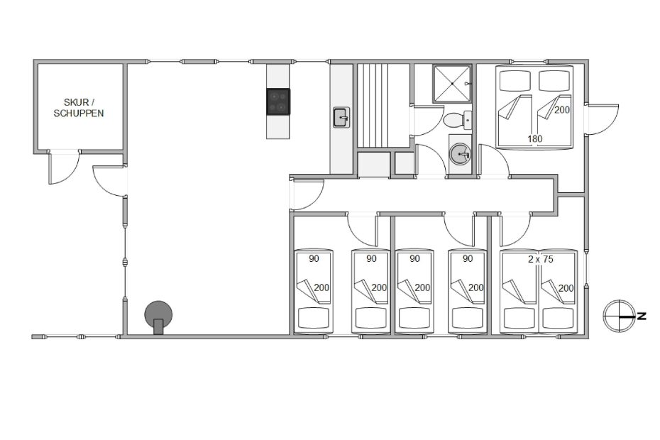 Sommerhuset er praktisk og lyst indrettet med et stort opholdsrum med køkkenafdeling, spisestue og stue i ét. Dette er absolut husets hjerte og naturlige samlingspunkt. Her kan alle være med i fællesskabet, også selvom du står for maden.