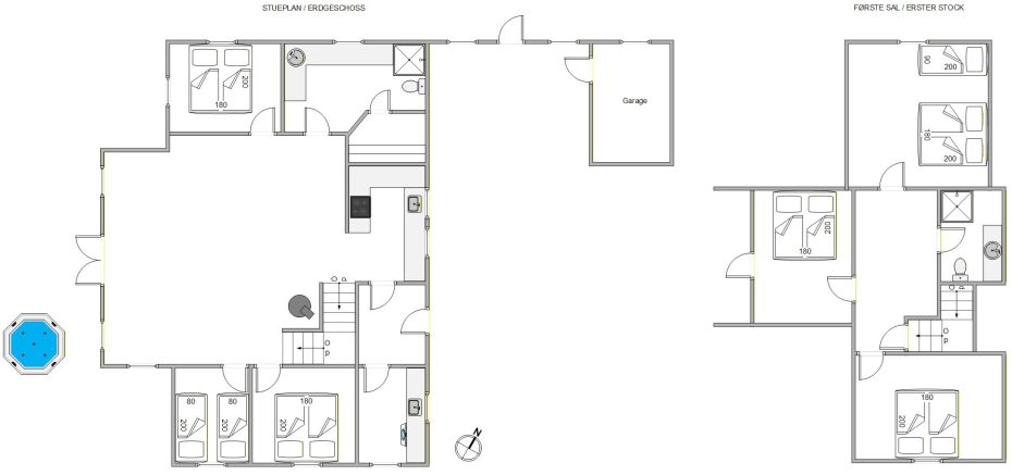 Sommerhusets 12 sovepladser er fordelt på 6 gode soveværelser, hvoraf de 3 af dem ligger på 1. salen. Værelserne er indrettet med komfortable senge, og også her er der gulvvarme. Som et ekstra plus har det ene værelse på 1. salen udgang til en skøn, overdækket altan.