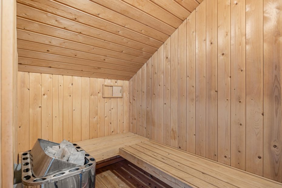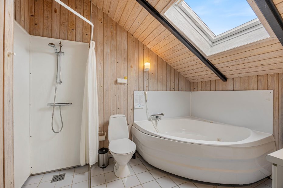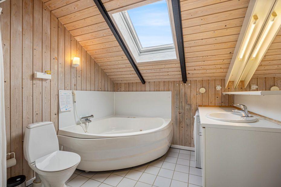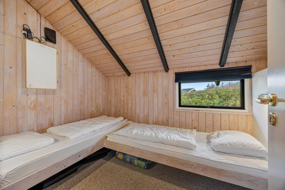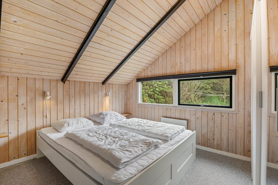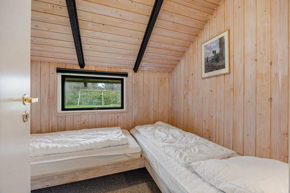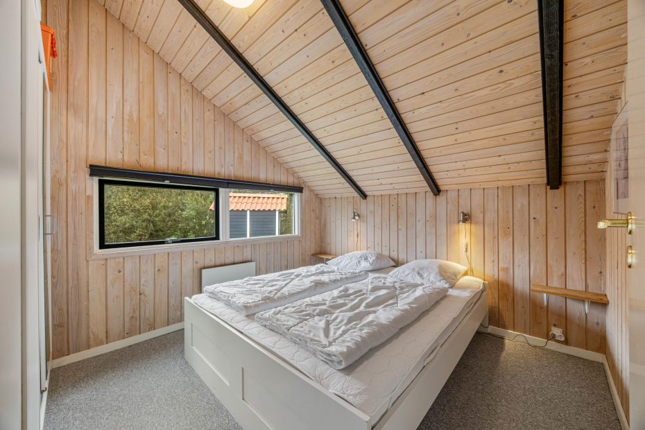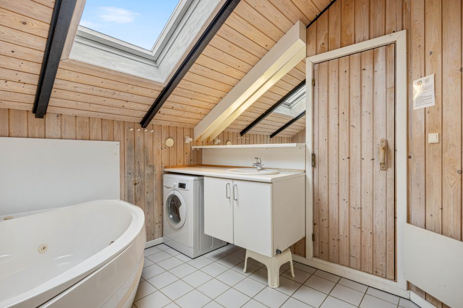 De 4 soverum er praktisk fordelt i hvert sit hjørne – to har dobbeltsenge, mens de andre er indrettet med to enkeltsenge. Alle værelser har gulvtæppe. Her er et lille gæstetoilet samt et rummeligt badeværelse med boblebad og indgang til saunaen. Det er perfekt afslapning efter en rask tur til vandet. Her er der desuden både vaskemaskine og tørretumbler, hvilket gør alting nemmere og mere fleksibelt.