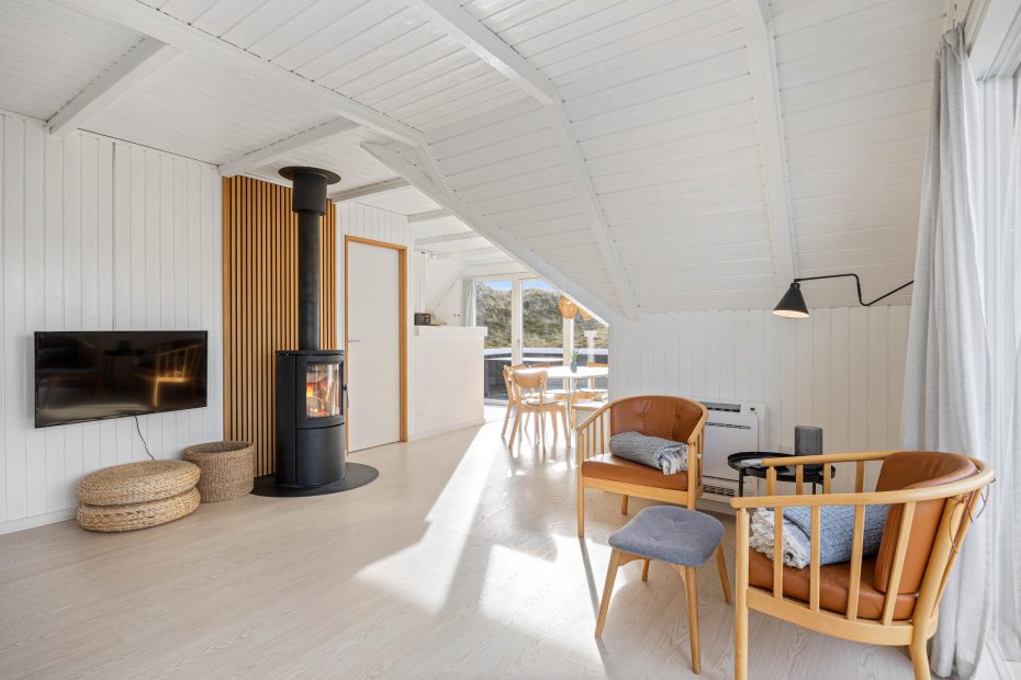 En energivenlig varmepumpe varmer sommerhuset op, men I kan også tænde op i brændeovnen i opholdsrummet, der både varmer og er med til at sætte gang i den hyggelige feriestemning.