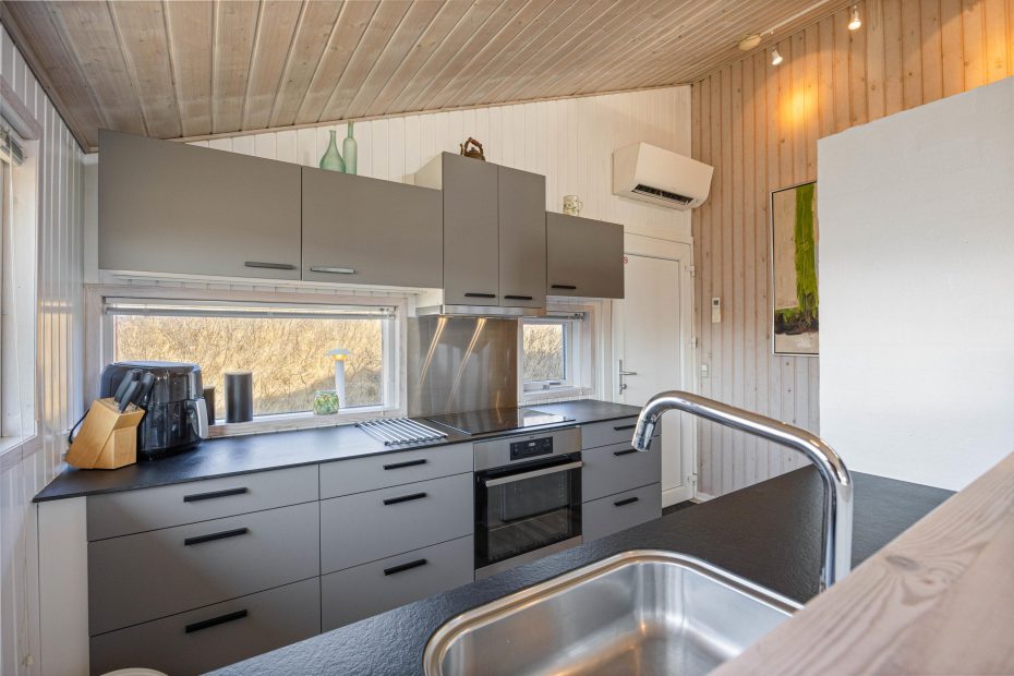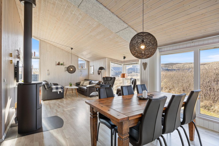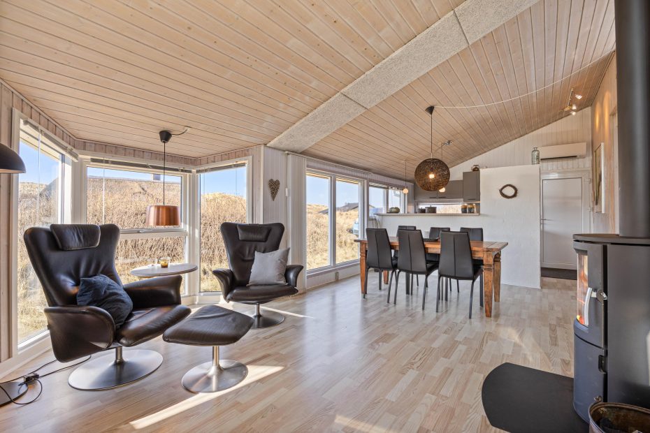 I sommerhusets køkkenalrum finder i den afslappende stue med de smukke brune lædermøbler. Her har I mulighed for at nyde den skønne brændeovn, tage en lille lur eller se en god film. I den anden ende af køkkenalrummet finder i det moderne køkken. Her kan I se ind til stuen, så i stadig kan hyggesnakke med jeres familiemedlemmer.