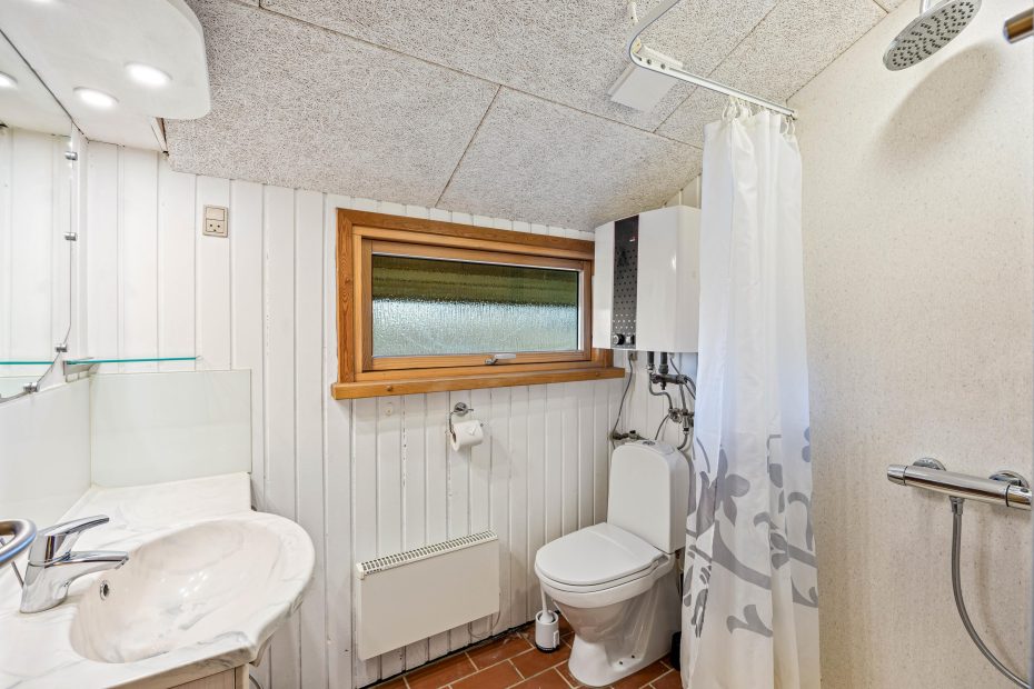 I badeværelset er der gulvvarme og en bruseniche. Og herfra er der adgang til sommerhusets sauna, som er perfekt efter en god gåtur langs vandet.