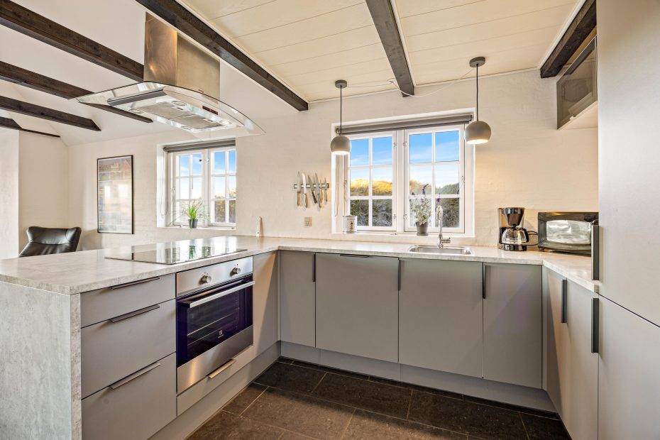 Køkkenafdelingen, som ligger i åben forbindelse med stuen-opholdsrummet, er veludstyret og praktisk indrettet med bl.a. induktionskomfur, mikroovn og opvaskemaskine.