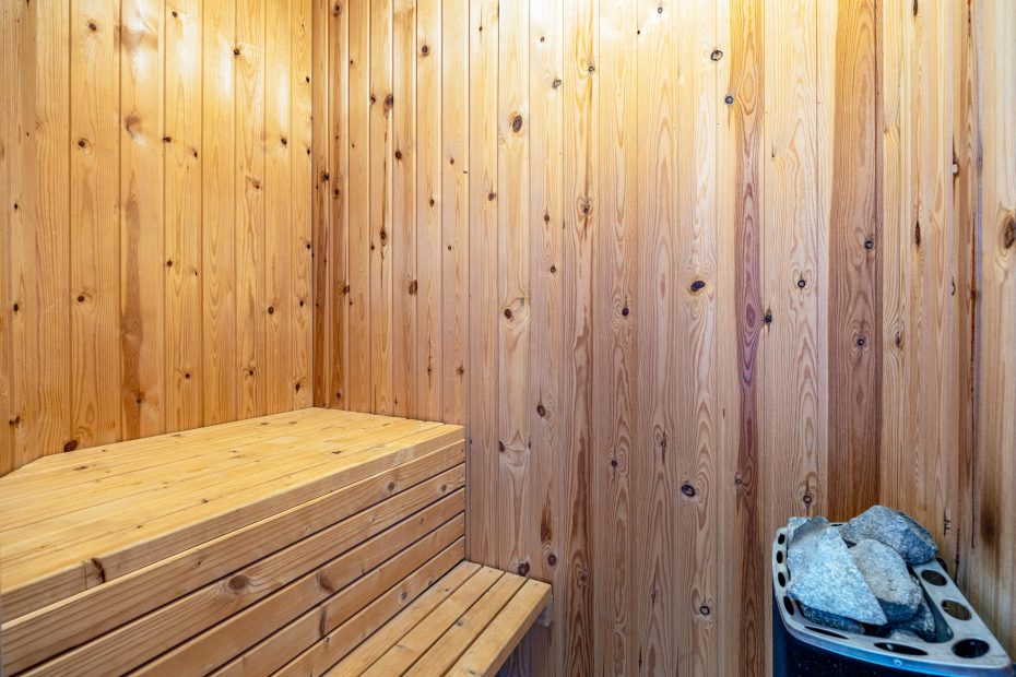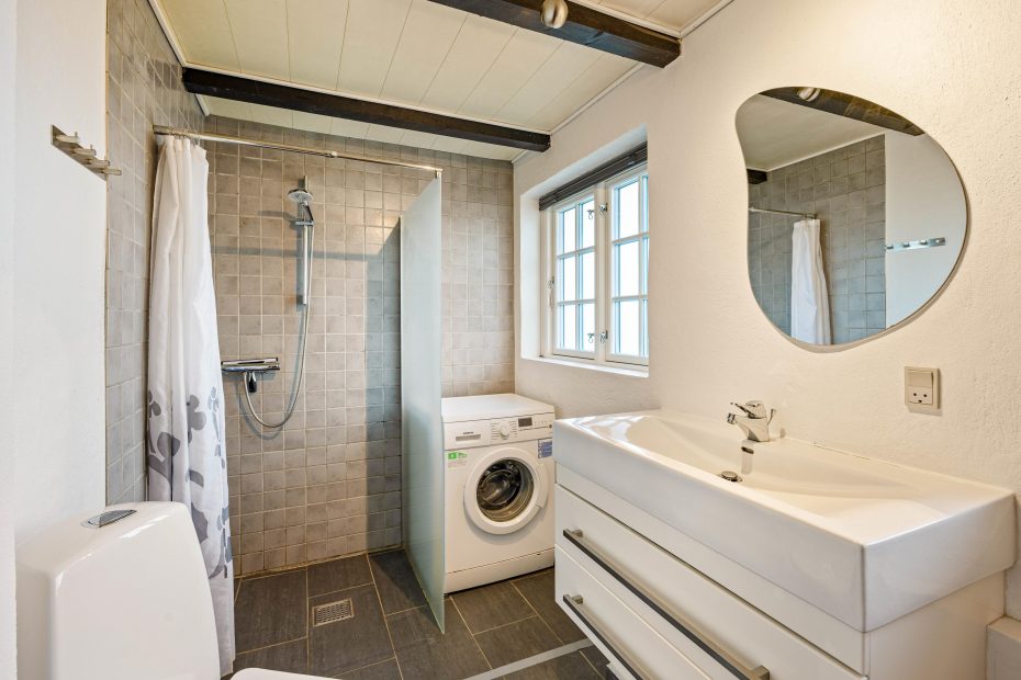 Badeværelse med gulvvarme, vaskemaskine og sauna