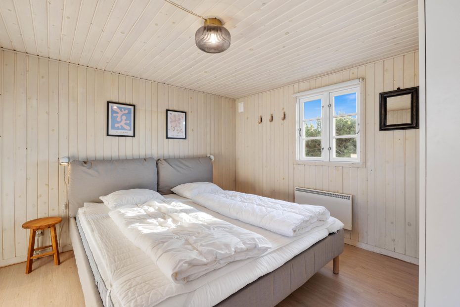 Feriehusets 4 sovepladser fordeler sig på 2 lyse soveværelser med dobbeltsenge.