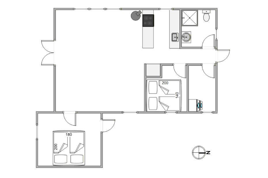 I dette godt indrettede feriehus venter jer en kombineret ophold- og spisestue i forbindelse med det åbne køkken. Køkkenet er praktisk og moderne indrettet og byder på både mikroovn, opvaskemaskine og køle-fryseskab.