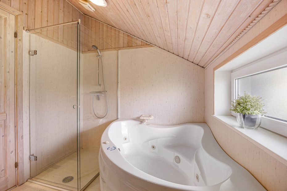 På det ene badeværelse er der lagt op til afslapning og velvære. Efter en spændende og oplevelsesrig dag i naturen kan I nyde varmen i saunaen eller det boblende spabad.