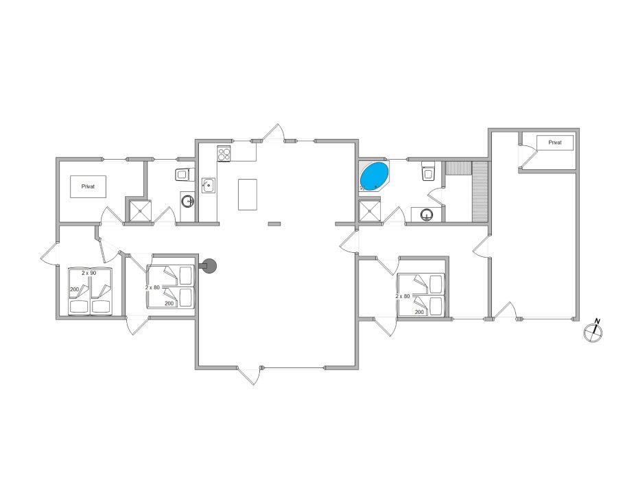 De 6 sovepladser er fordelt på 3 gode værelser med dobbeltsenge, hvor I kan få en god nats søvn og samle energi til morgendagens aktiviteter. Sommerhuset har 2 badeværelser, så der ikke opstår kø om morgenen.