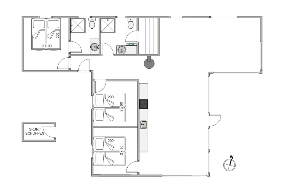 Her står 3 fine soveværelser med hver sin dobbeltseng til rådighed til jer – og med 2 badeværelser i dette skønne feriehus, er det nemt at være 2 familier på ferie sammen.