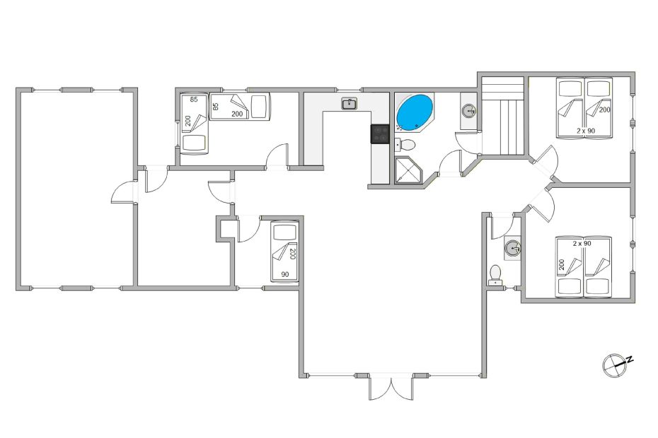 Derudover er der både et badeværelse og et gæstetoilet, så I undgår kø om morgenen. På badeværelset er der desuden en sauna, som medvirker til en ekstra afslappende ferie. Dernæst er der 4 soveværelser med henholdsvis 2 dobbeltsenge og 3 enkeltsenge, som sikrer jer en god nats søvn, så I er friske til feriens oplevelser.