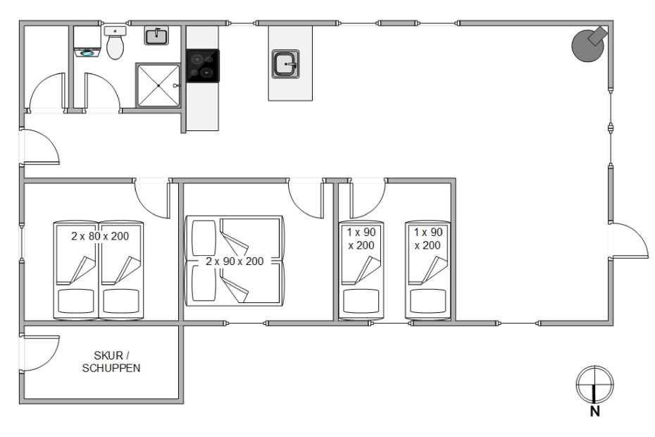 Sommerhusets 6 sovepladser er opdelt på 3 soveværelser, 2 med dobbeltsenge og 1 med 2 enkeltsenge. Med den gode internetforbindelse kan aftenens film eller jeres ynglings serie sagtens streames. Til husets bekvemmeligheder hører dertil både mikrobølgeovn, opvaskemaskine og vaskemaskine.
