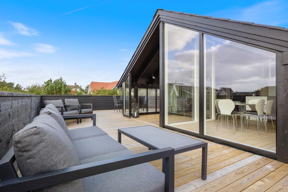 Når solen står højt på himlen og fuglene synger, er det oplagt at trække ud på terrassen, som ligger i forlængelse af alrummet. Terrassen er afskærmet med stakit, så I kan sidde ugerenet og nyde solen og det dejlige landskab.