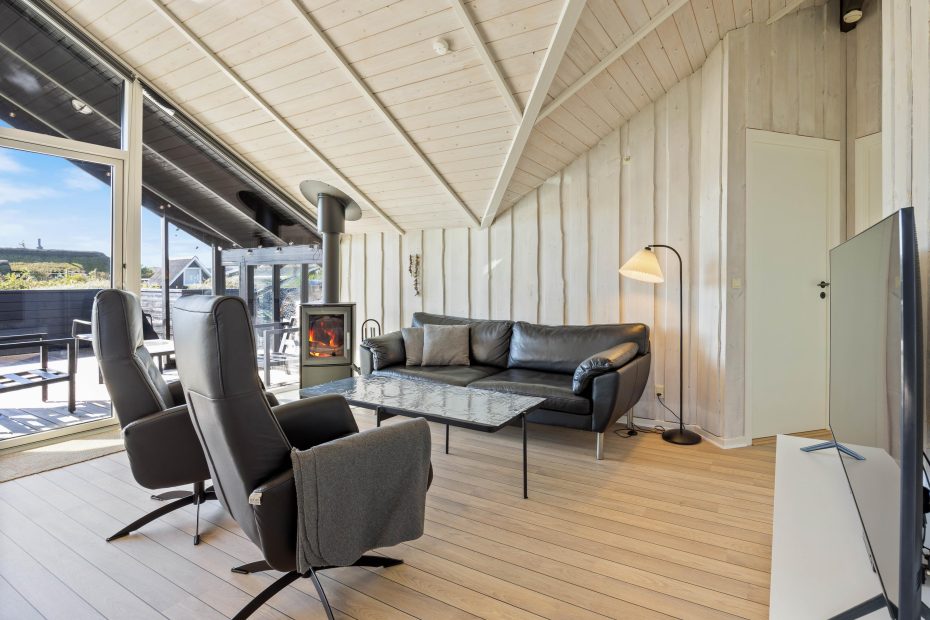Spisepladsen er placeret ved de store vinduer, så I har mulighed for at nyde den dejlige udsigt over en dejlig middag med familien. På kolde og blæsende dage kan I tænde op i brændeovnen og nyde varmen og en kop kaffe i sofaen.
