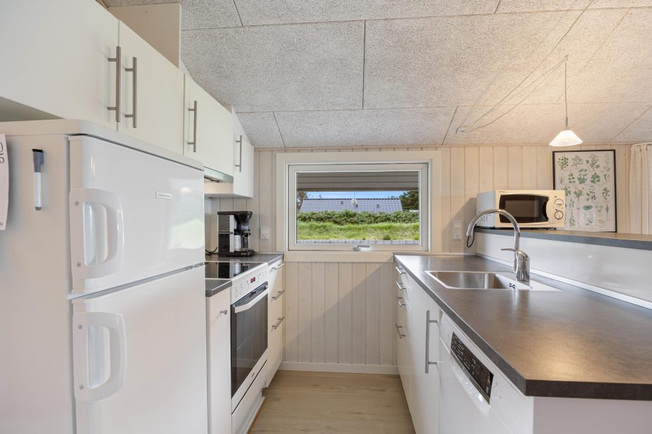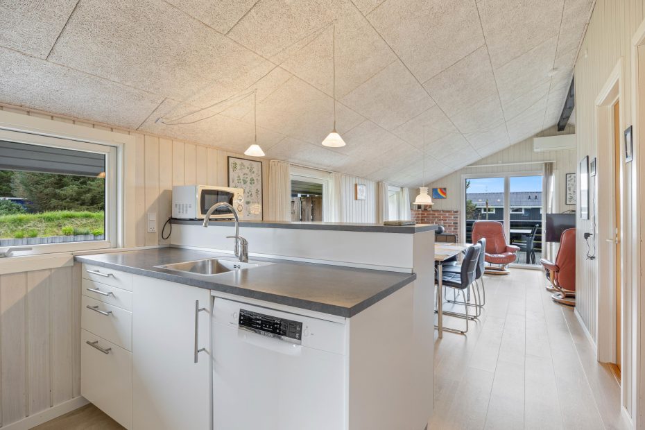 Over halvmuren fra den lyse køkkenafdeling, med bl.a. mikroovn, kan man nemt følge med i samtalen ved spiseafdelingen i opholdsstuen. Stuen er hjemligt indrettet og med brændeovn, hvor man også på koldere dage kan nyde en god bog og en kop kaffe foran den knitrende ild i brændeovnen.