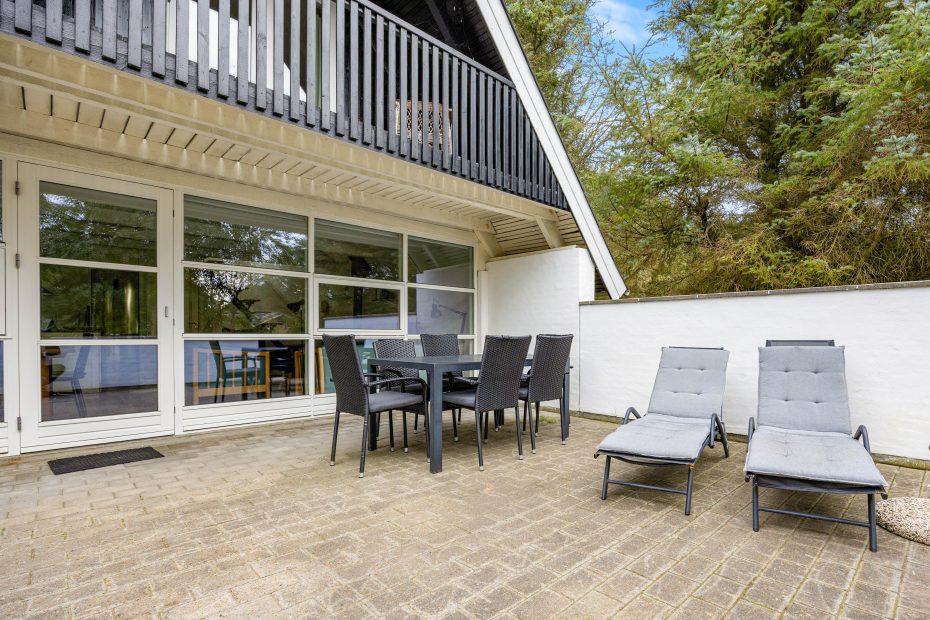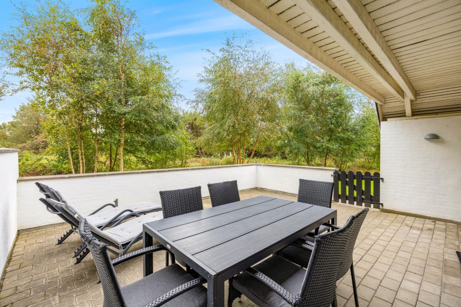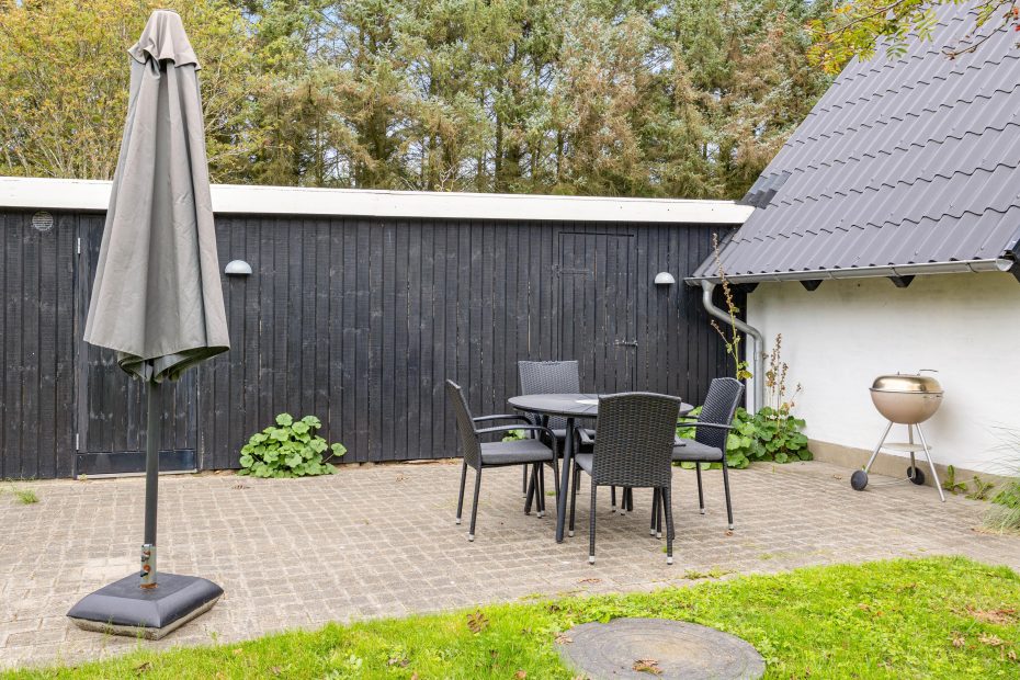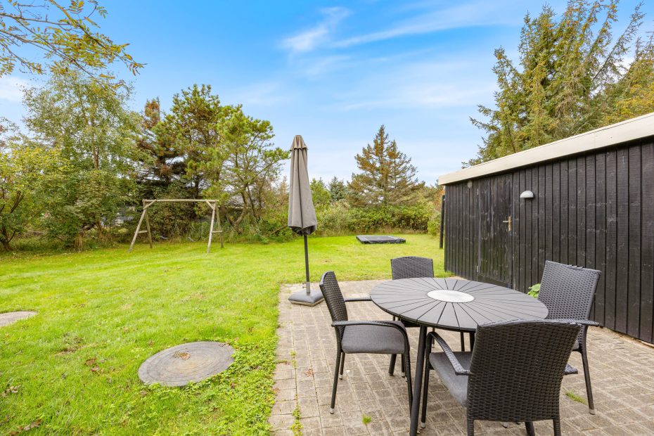 Sommerhuset ligger på en 2.027 kvadratmeter stor, velholdt grund. På græsplænen er der god plads til leg for de små og de firbenede feriegæster, og der er desuden opsat et gyngestativ. Den lukkede terrasse er udstyret med havemøbler, liggestole og grill, og her kan I helt ugeneret nyde de dejlige sommerdage.