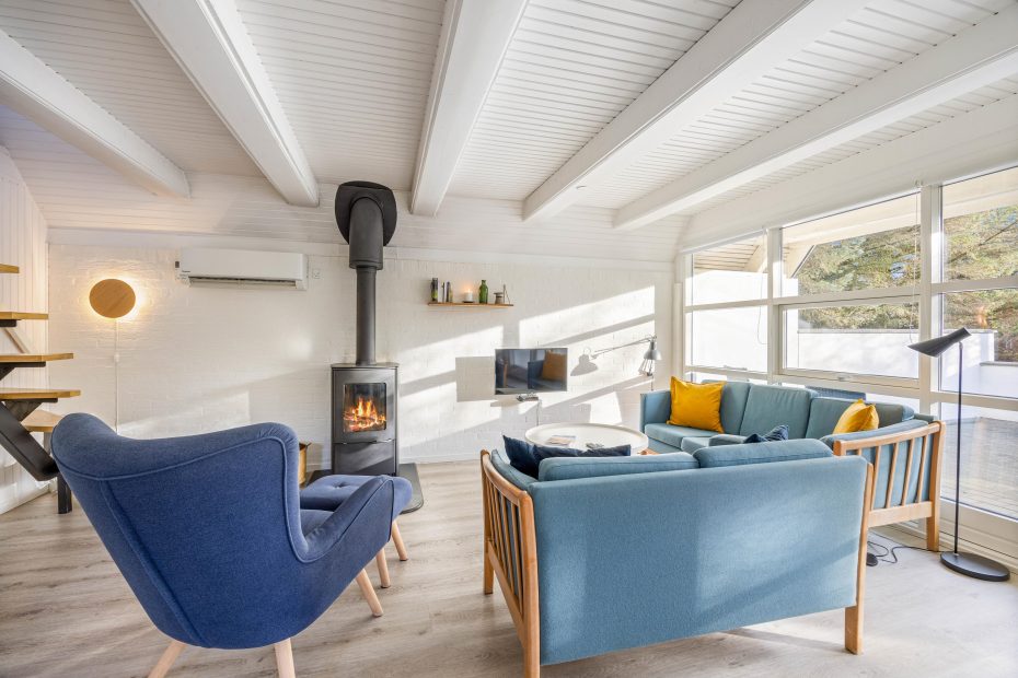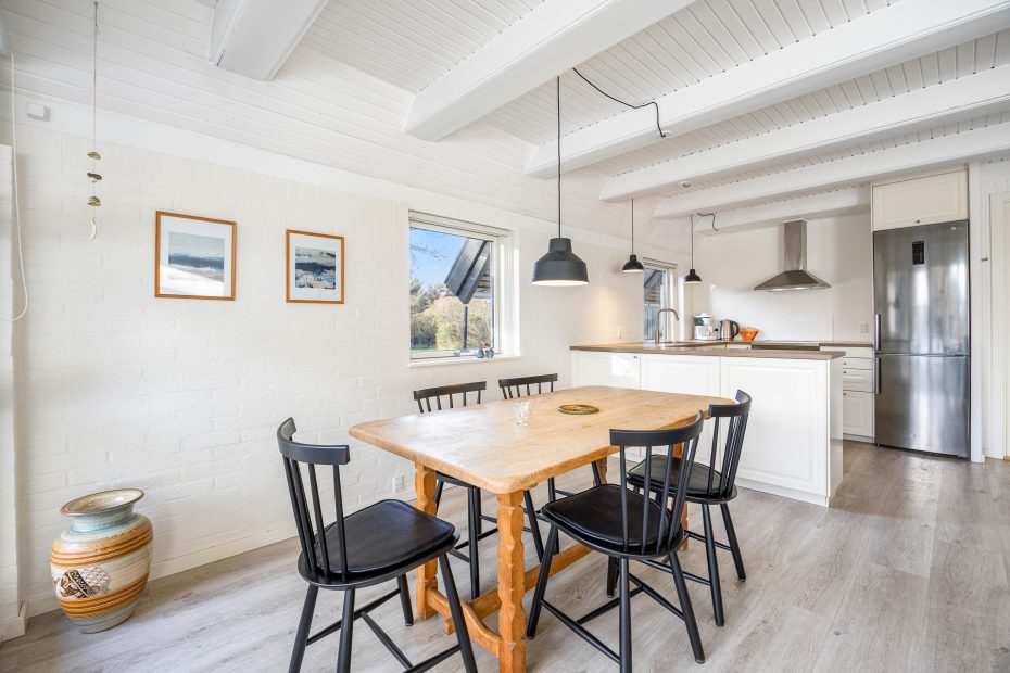 Det veludstyrede køkken er slået sammen med stuen, hvilket skaber et stort fællesrum med plads til afslapning og skønne feriestunder. Den klassiske brændeovn spreder varme og god stemning, så selv de mest barske efterårs- og vinterdage bliver utrolig hyggelige.
