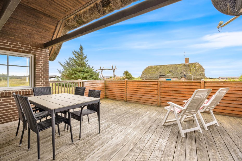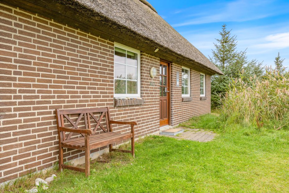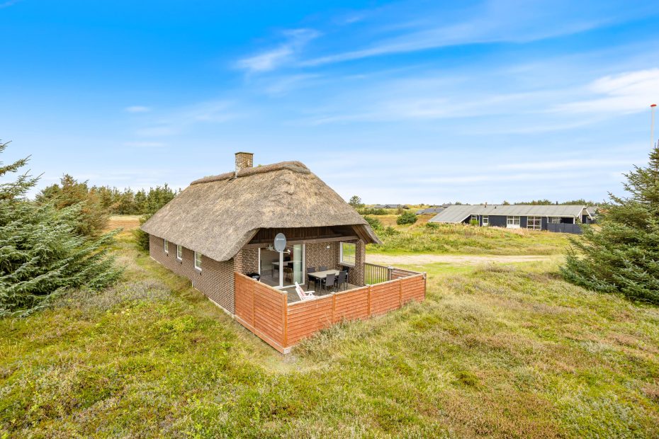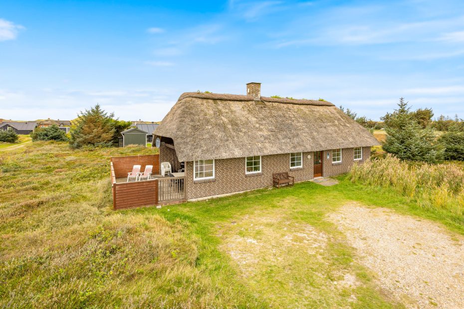 Feriehuset er beliggende på en flot og lyngklædt naturgrund, kun afbrudt af en lukket terrasse. Hele området er charmerende, og ikke langt mod vest ændrer landskabet sig til et kuperet klitområde. Havet kan tydeligt høres fra terrassen.