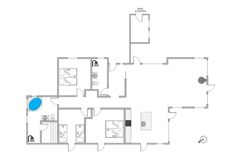 Huset råder over 3 meget dejlige og lyse værelser, alle med rigtig god skabsplads. Her er 2 supergode badeværelser, og i det ene finder du også spa og sauna, lige til et par timers forkælelse efter en lang tur ved Vesterhavet, som du finder indenfor 5 minuters gang.