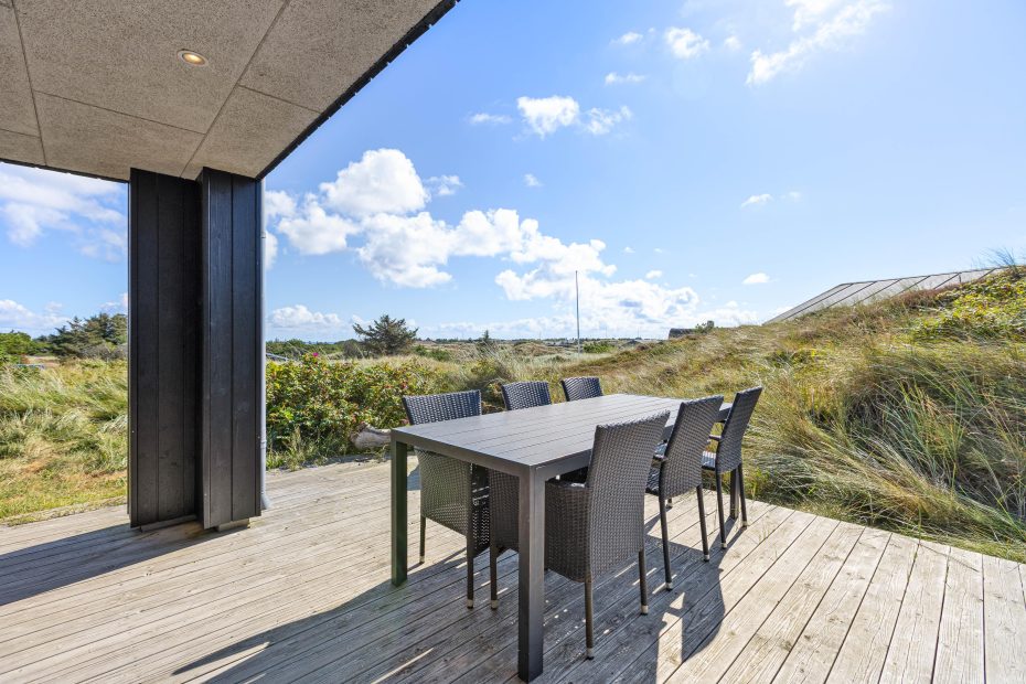 I dette flotte moderne sommerhus, er der rig mulighed for hygge og samvær med hele familien, og det oven i købet i fantastisk smukke rammer. Her er god plads til at være sammen både inde og ude. De fine overdækkede terrasser giver dig mulighed for at nyde naturen i næsten al slags vejr, så tænd op i grillen, sæt dig godt til rette og nyd så den smukke udsigt. Efter en lækker middag fra grillen, kan du tage et glas vin i hånden og gå op på klittoppen bag huset og nyde en smuk solnedgang mod vest, og står du tidligt op får du samme smukke oplevelse når solen næste dag stiger op mod øst over Ringkøbing Fjord.