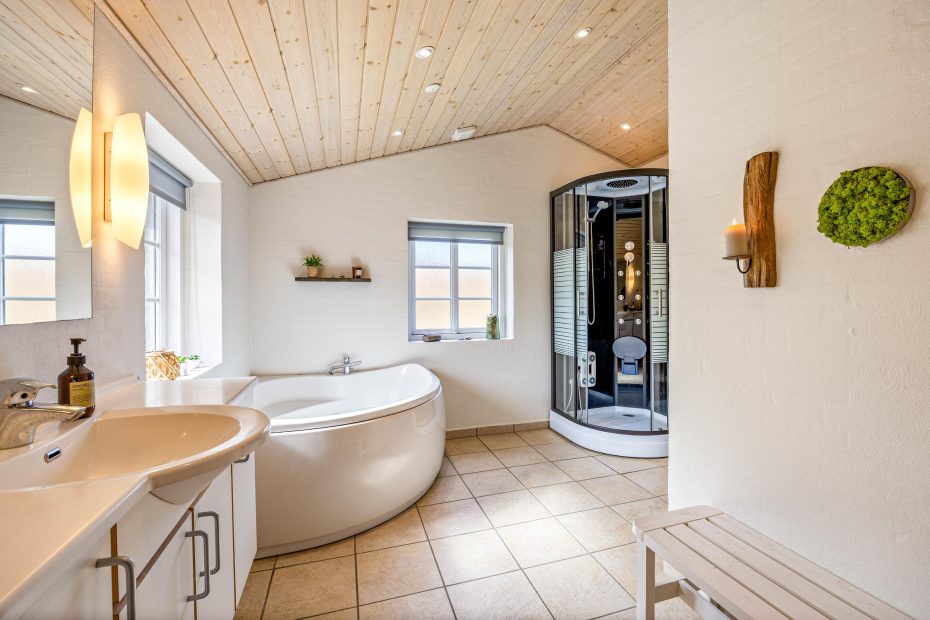Huset har 2 badeværelser, som begge har bruseniche og gulvvarme. I det store badeværelser finder I desuden et spabad samt en sauna, hvor I kan læne jer tilbage og slappe af efter en lang dag på Vestkysten.