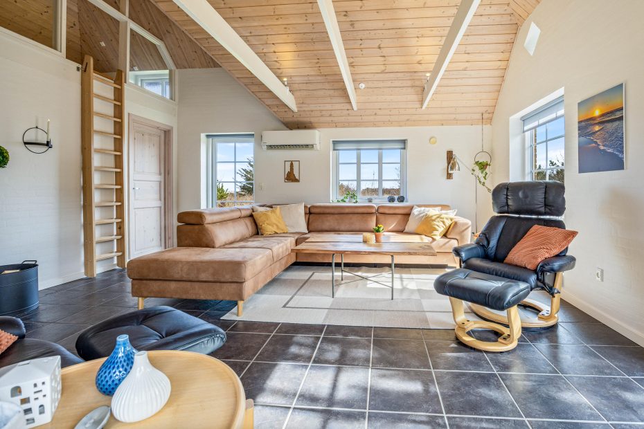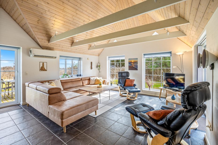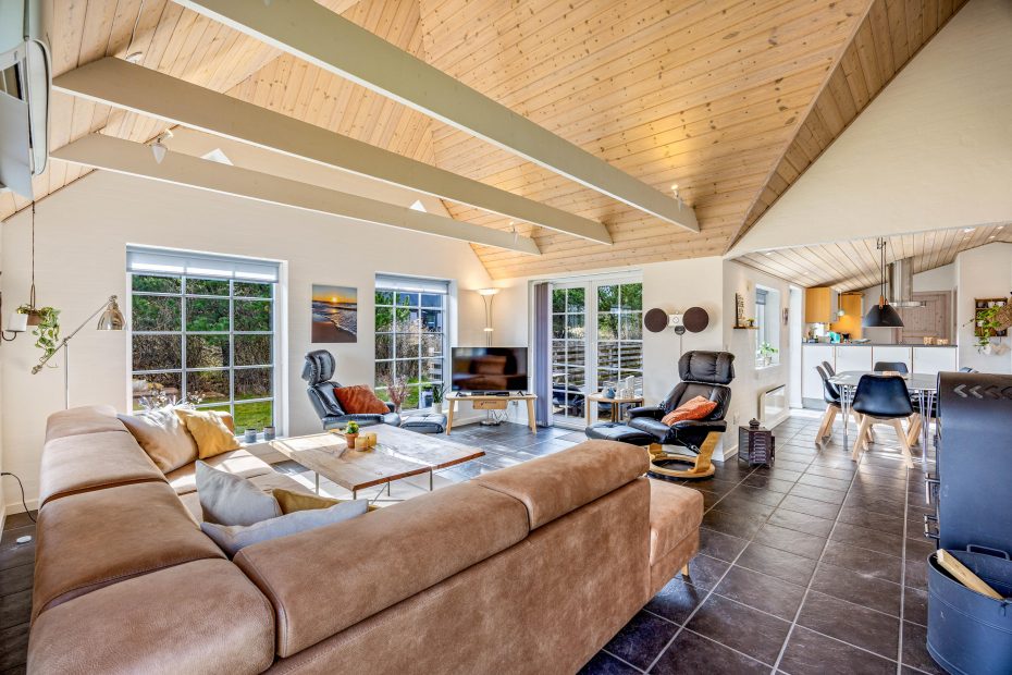 Feriehuset har i alt 3 soveværelser samt en hems med tilhørende soveplads. I hjertet af huset, nemlig stue og køkkenalrum, kan I samles og hygge med brætspil ved spisebordet samt fælles madlavning. Om aftenen kan I samles i sofaen foran fjernsynet, hvor I kan streame film fra husets Chromecast. I kan også tænde op i brændeovnen og nyde hyggen og varmen fra de knitrende flammer. Huset opvarmes også af den energibesparende luft til luft varmepumpe.