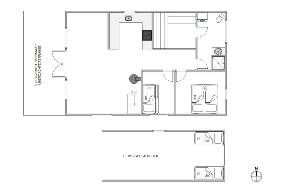 I feriehuset er der 2 soveværelser – 1 med køjesenge og 1 med en dobbeltseng. Derudover er der en hems, hvor der er plads til ekstra sovepladser – her vil børnene helt sikkert elske at overnatte på ferien. Sommerhuset har desuden 1 badeværelse med gulvvarme og adgang til saunaen, der altid står klar til at forkæle jer med en god gang afslapning.