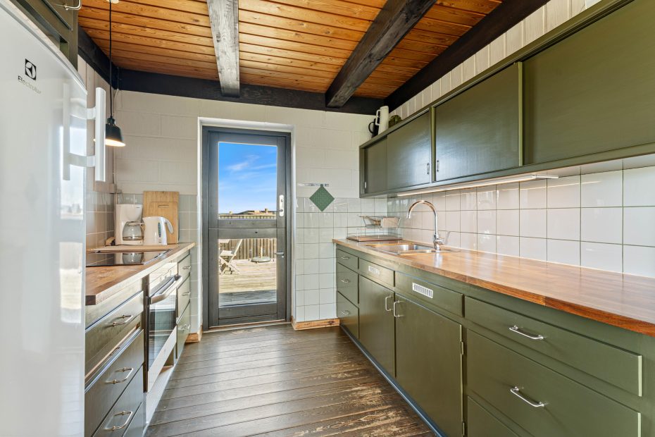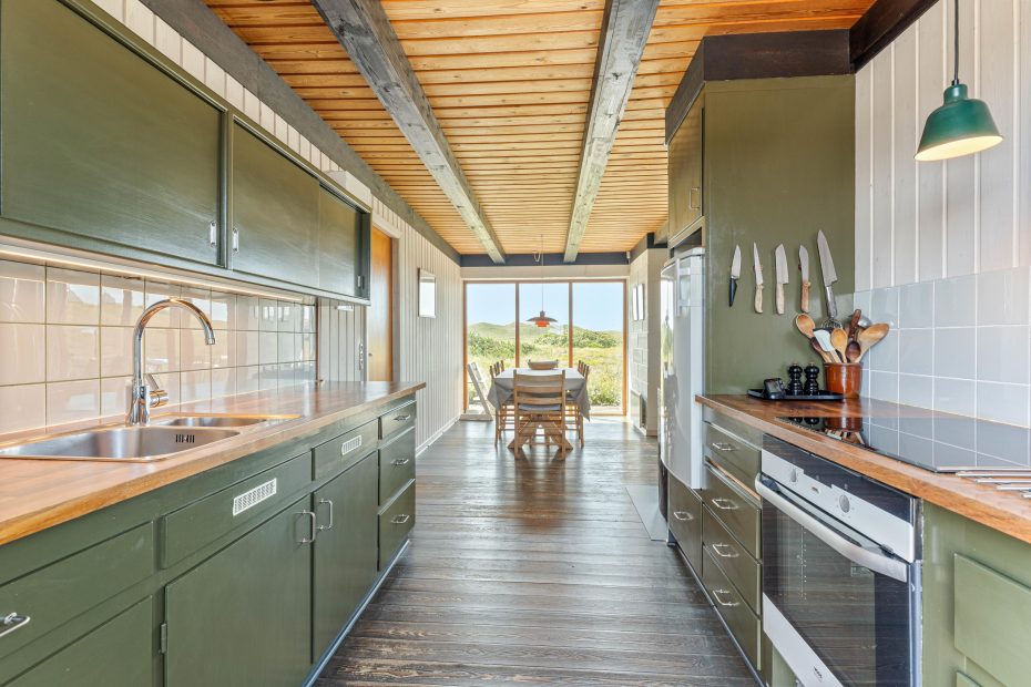 Det store køkken/alrum indbyder til mange fælles timer på sofaen eller i lænestolene, og ved spisebordet er der masser af plads til hyggelige brætspilsaftner. I det lange køkken, der har en lys og klassisk stil, kan hele familien lave lækker mad sammen.