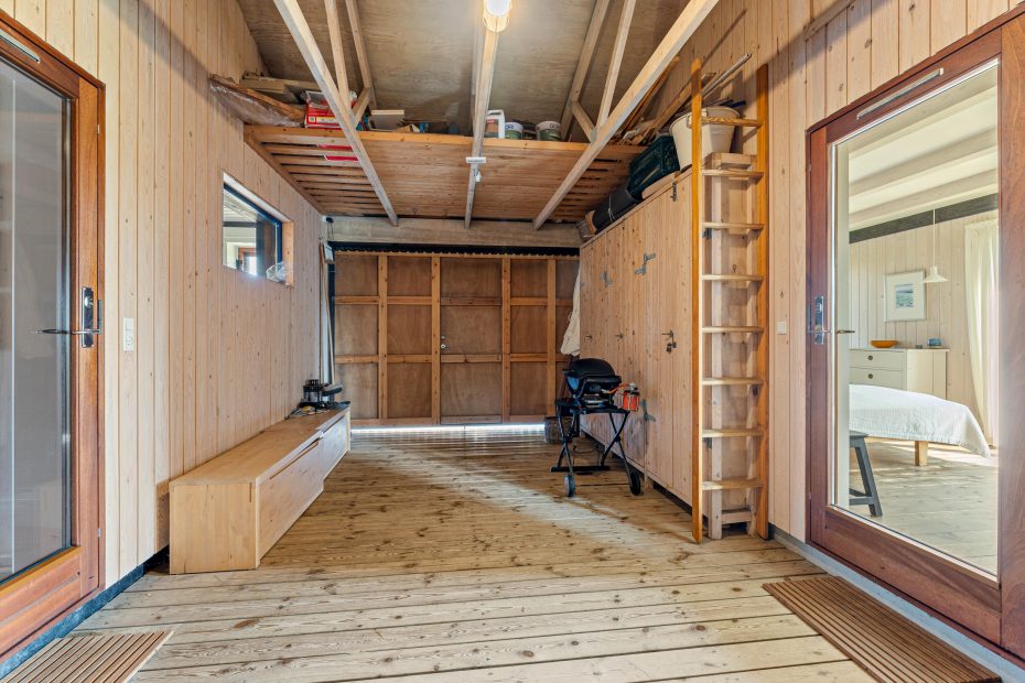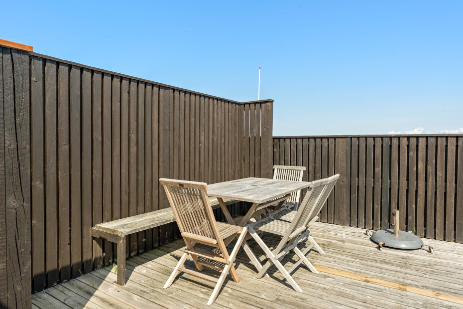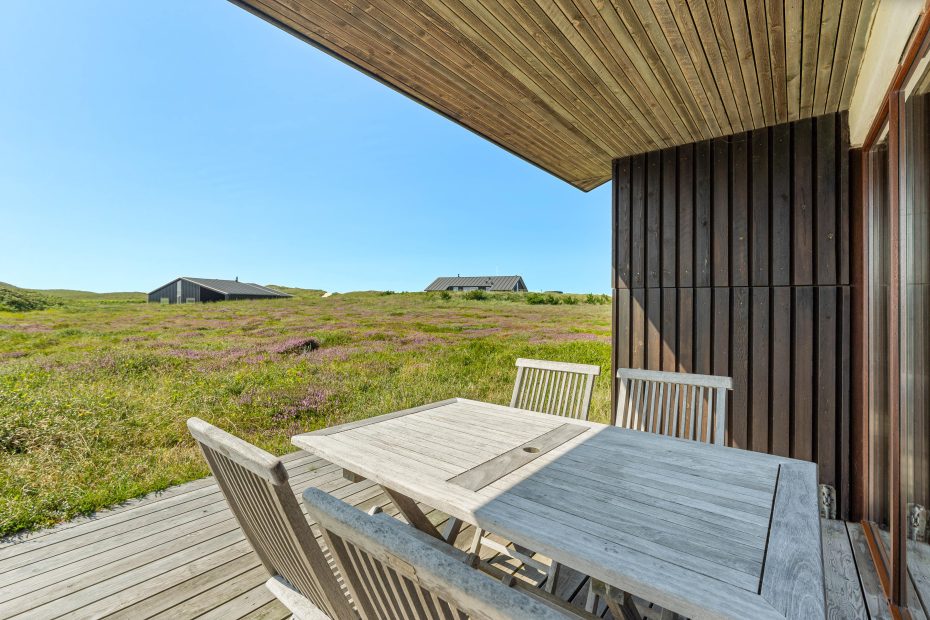 Feriehuset er ikke kun indbydende indeni – også den store naturgrund og husets udearealer er perfekte til en afslappende ferie. Især de mange siddehjørner på terrassen gør det muligt at bevæge sig med solen i løbet af dagen eller at finde en skyggeplads. Den overdækkede del af terrassen giver læ for vind og vejr, imens I nyder udsigten.