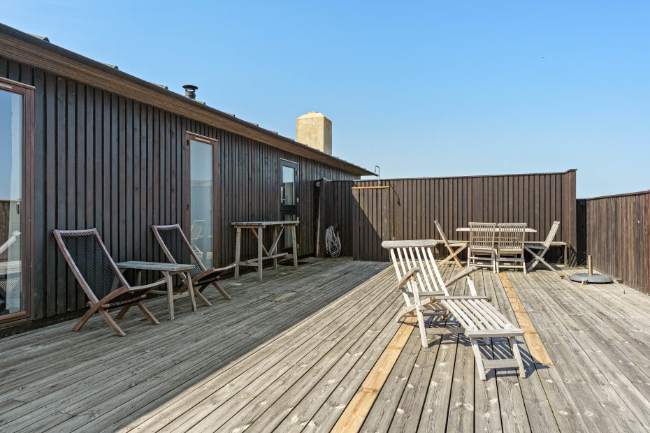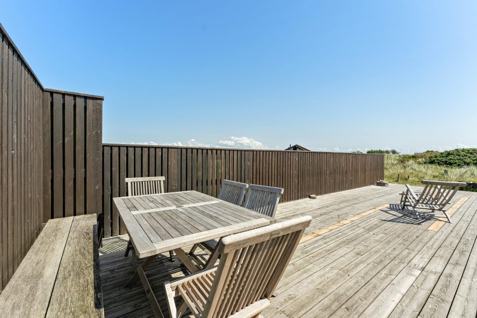 Den udendørs bruser på den store terrasse er en ekstra bonus ved dette sommerhus. Efter en gåtur på kun 250 meter kan I skylle jer af efter at have taget en dukkert i Vesterhavets friske bølger.