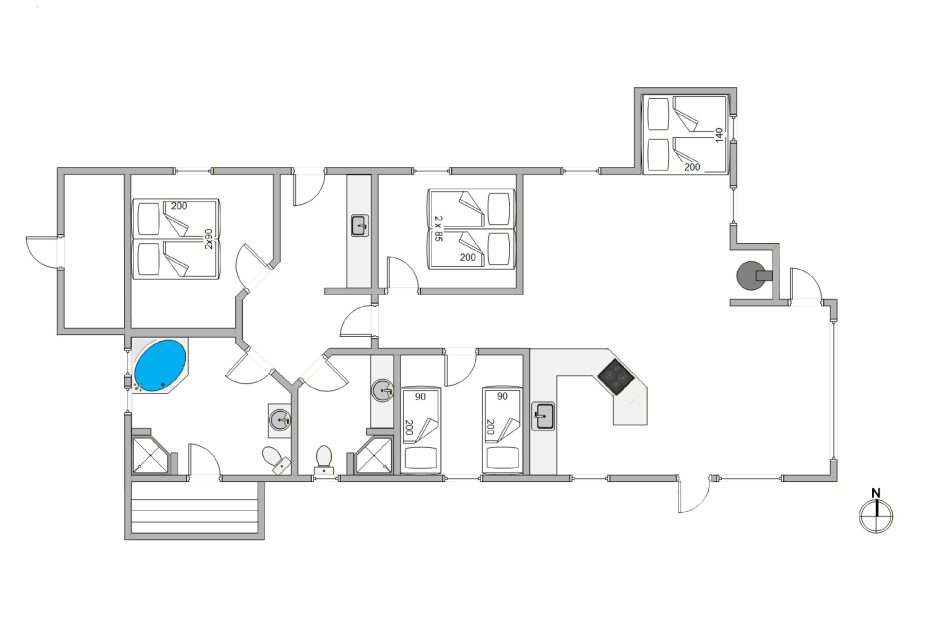 Sommerhuset har 3 soveværelser og en alkove i stuen, så der i alt er 8 sovepladser i huset. Alle soveværelserne har trægulv og lyse trævægge. 2 af værelserne har hver en dobbeltseng og på det sidste værelse er der 2 enkeltsenge. Der er 2 badeværelser i sommerhuset, begge har gulvvarme og en bruseniche. På det store badeværelse er der også en hjørnespa og en god sauna.