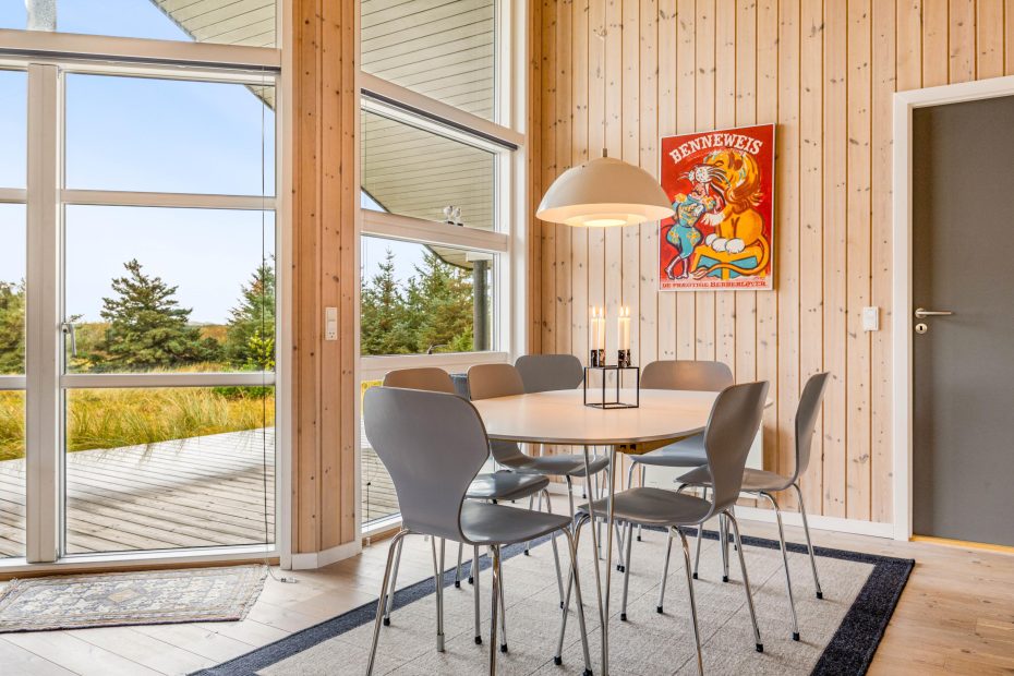 På Klitsvinget 40 er der gjort meget for, at I skal føle jer hjemme fra første ferieøjeblik. Den lyse træbeklædning, brændeovnen, de høje lofter og de store vinduer, der giver et fantastisk lysindfald, er alt sammen med til at skabe en behagelig og imødekommende atmosfære.