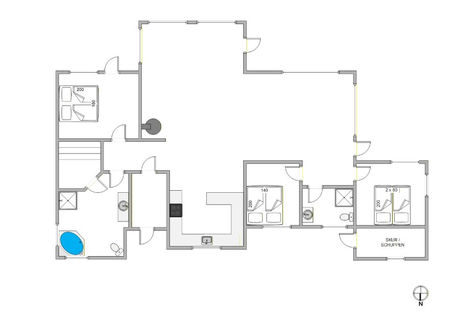 Dette hyggelige feriehus har tre rummelige soverum, hvilket sikrer, at I alle kan finde jer godt til rette. Takket være de to badeværelser vil der aldrig være kø om morgenen. Gulvvarme i badeværelset giver ekstra komfort på kolde dage, og saunaen samt tømmespaen tilbyder den ultimative afslapning efter en lang dag med eventyr.