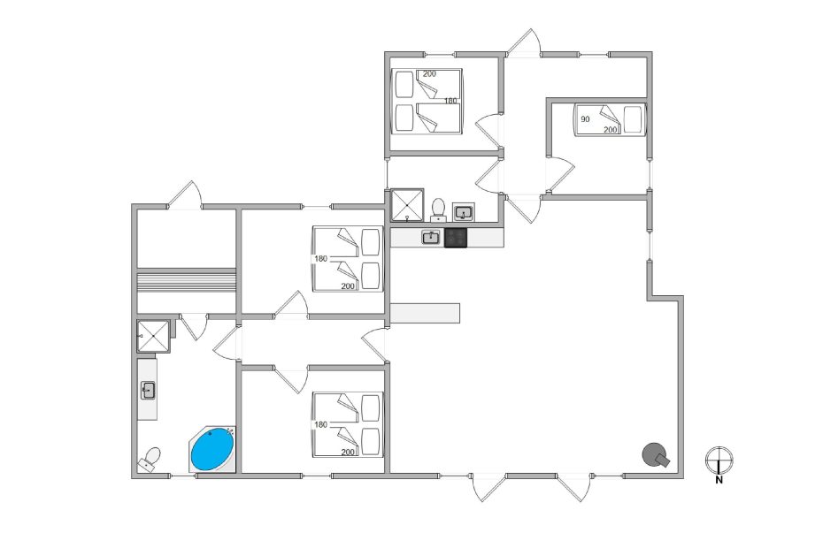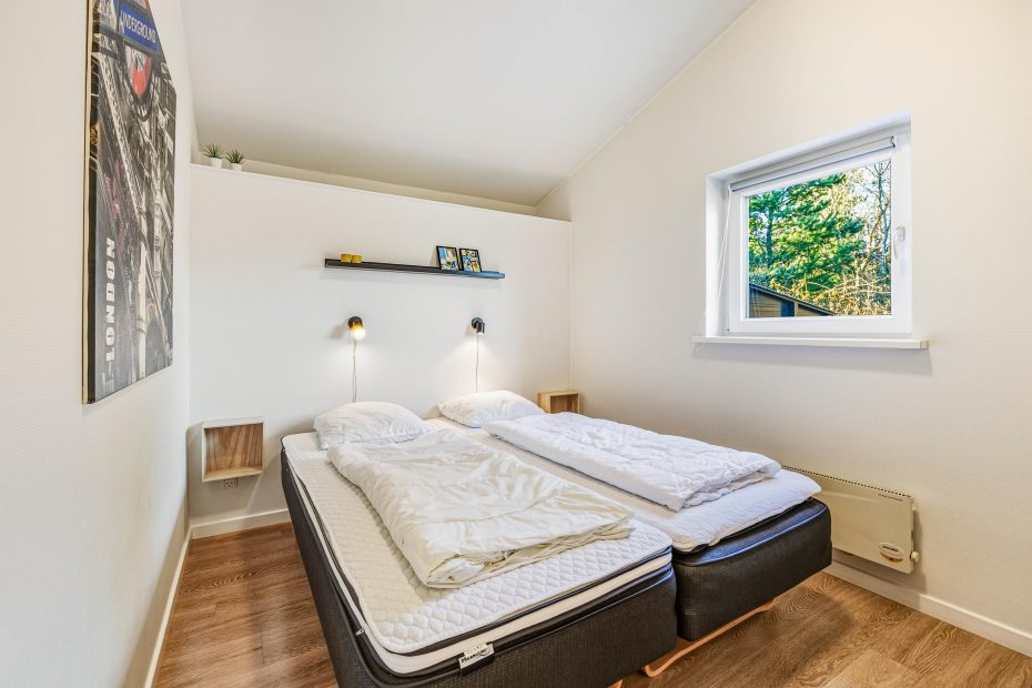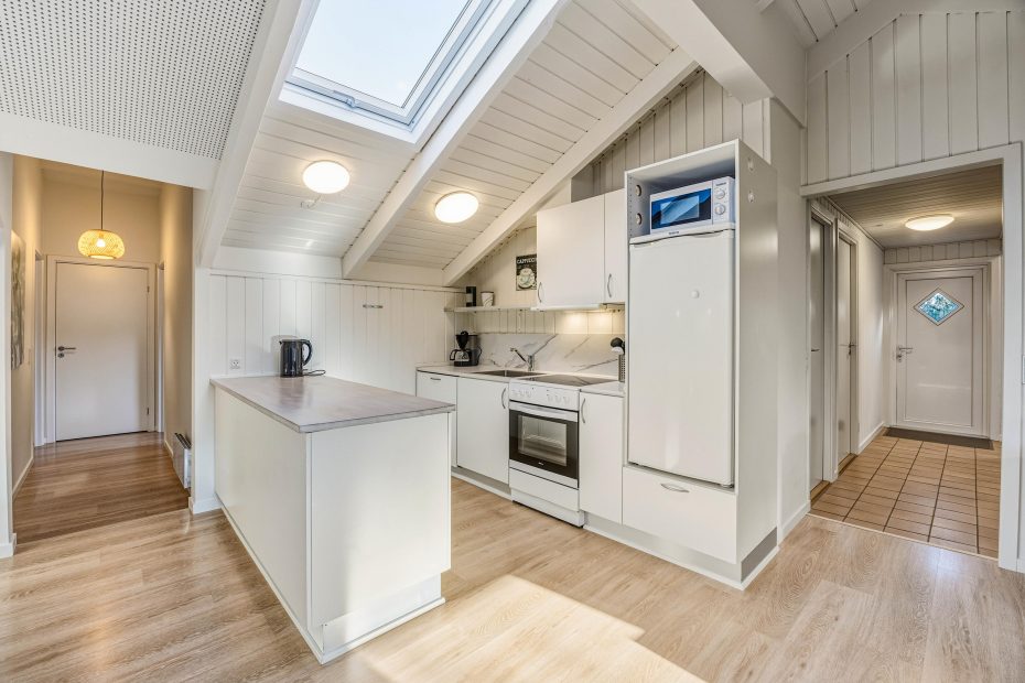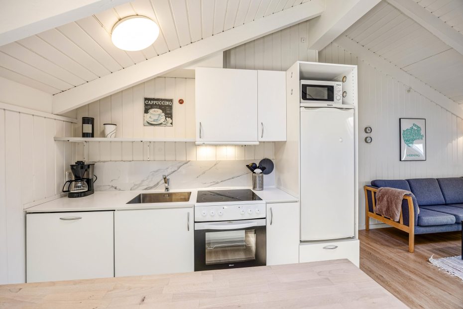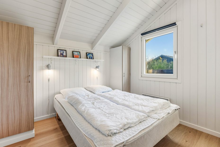 Feriehuset på Hvidbjergvej 9 har plads til 7 personer fordelt på 4 soveværelser. Her er 3 soveværelser med dobbeltsenge og et værelse med en enkeltseng, hvilket sikrer en god nats søvn for alle. Køkkenet står i åben forbindelse med stuen og er udstyret med mikroovn, opvaskemaskine og 100 liters separat fryser, så I nemt kan lave mad og opbevare jeres dagligvarer. Yderligere finder I både en vaskemaskine og en tørretumbler, så I kan tage jer af al praktisk vask.