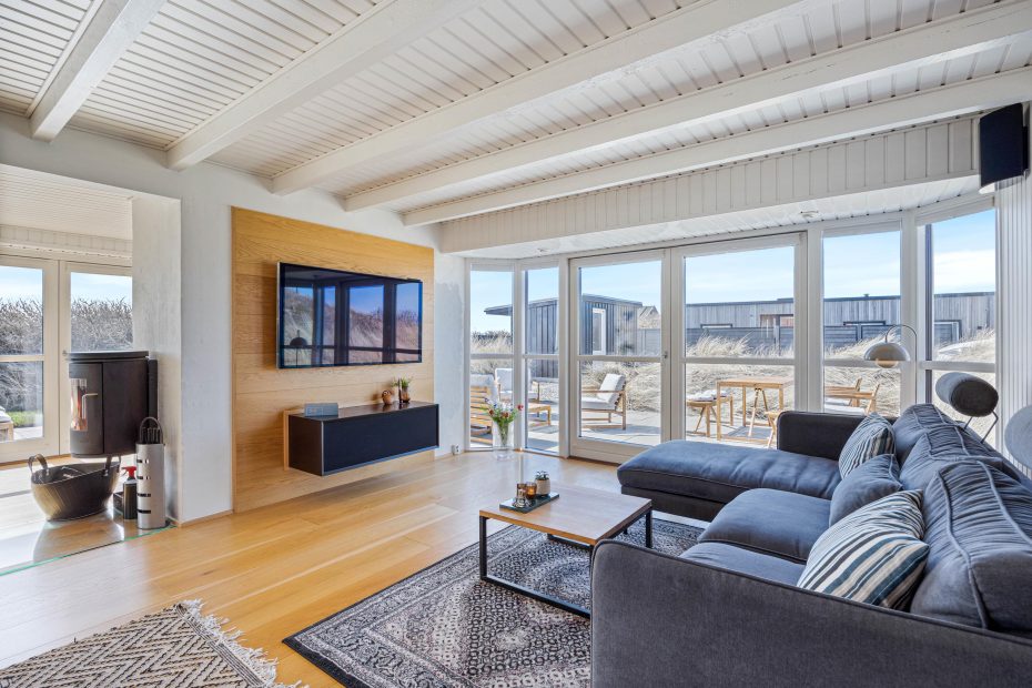I stuen sørger de store vinduespartier for masser af lys, især på de solrige dage. Her finder I også brændeovnen, som er god på de kolde dage – her sørger de knitrende flammer for både varme og ægte somerhushygge, når regnen slår på ruden udenfor.