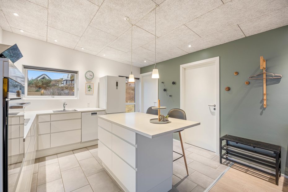 Det smarte og veludstyrede køkken indbyder til hygge med fællesskab omkring madlavningen, om man selv rører i gryden eller har åbnet en flaske vin og holder kokken med selskab siddende på en barstol ved køkkenøen. For god og økonomisk varme sørger husets varmepumpe.