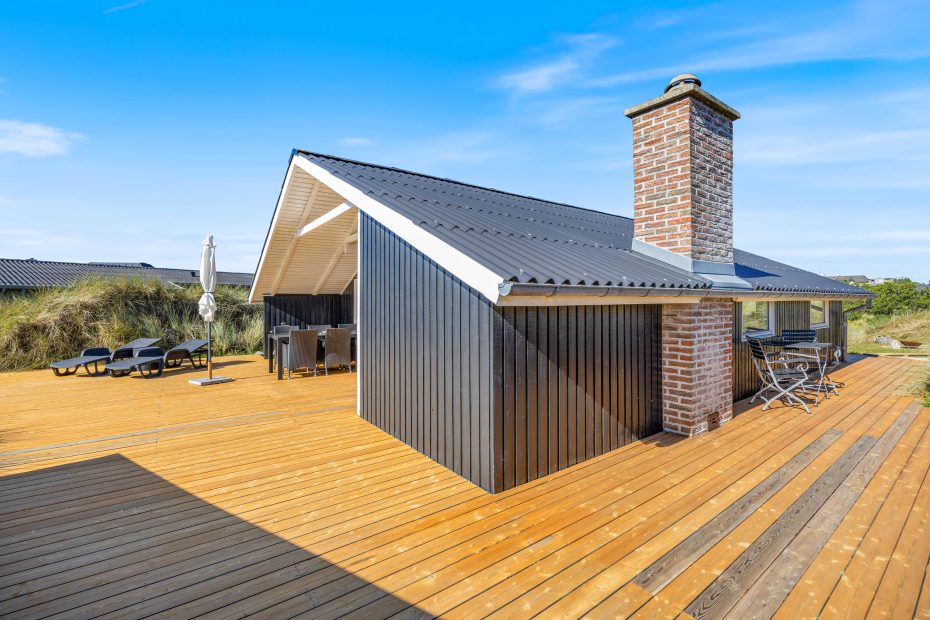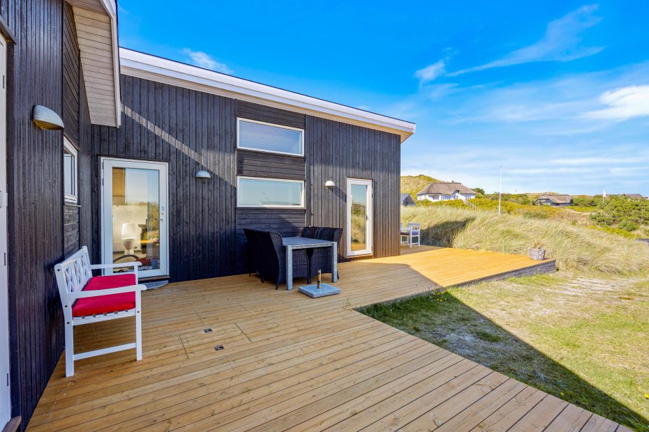 Sommerhuset er omgivet af en stor, lækker træterrasse, så I fra morgen til aften kan følge solens gang. Der er masser af hyggelige kroge, hvor I kan sætte jer til rette med en god bog eller en friskbrygget kop kaffe og nyde den friske luft, mens børnene leger i sandkassen.