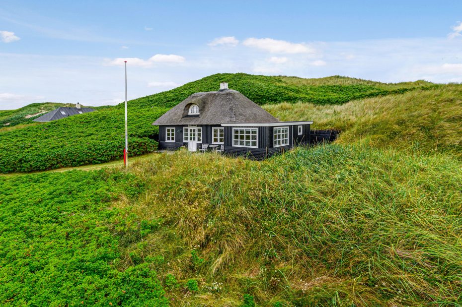 Sand Holms Vej 33 ligger smukt på randen af en klit. Det giver en skøn udsigt over området og dejlig læ for vestvinden. Hele vejen rund om huset er der anlagt terrasser, så I kan følge solen og altid finde et læhjørne, når der er behov for det. Når I sidder udenfor huset og nyder noget udetid, kan I ret høre lyden af havets bølger som en dejlig og afslappende baggrundslyd.